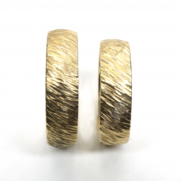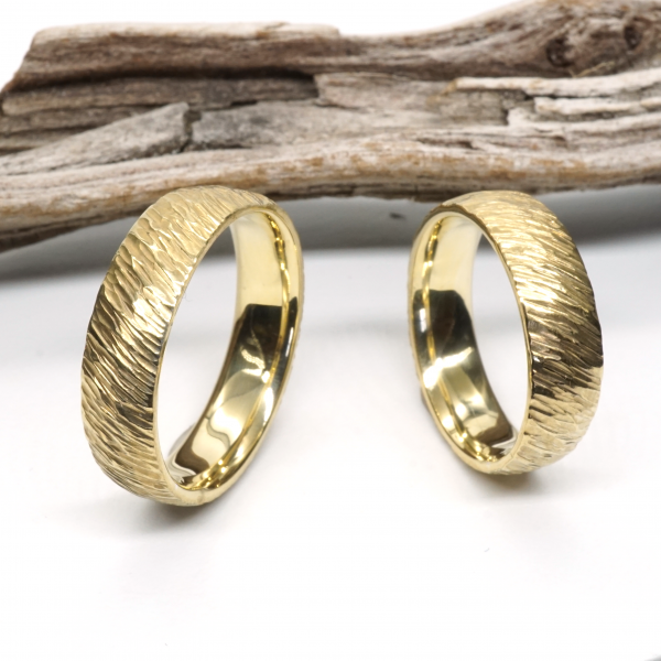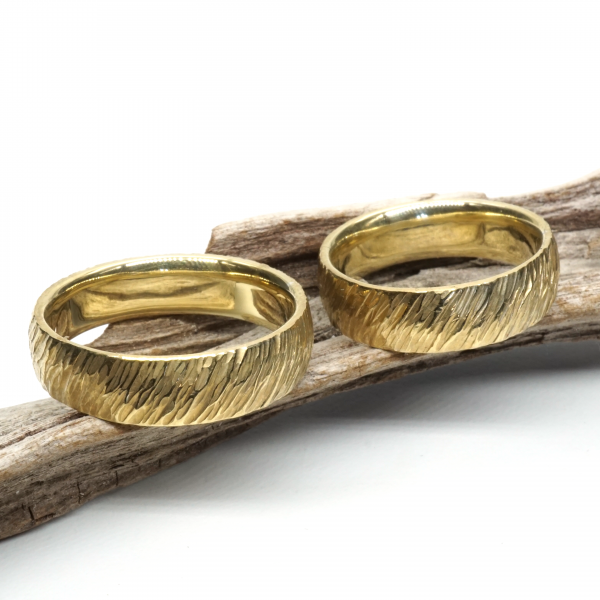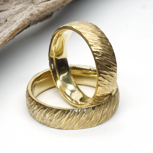 Die Oberfläche der Eheringe ist mit einem starken, feinen Hammerschlag gestaltet.