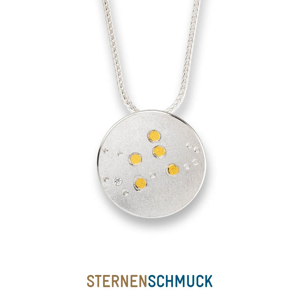 Die Sternenkonstellation des jeweiligen Sternzeichens ist auf einer aufgetieften Scheibe aus Sterlingsilber mit Punkten aus 900/- Gelbgold, einem Brillant und feinen Punzierungen dargestellt.