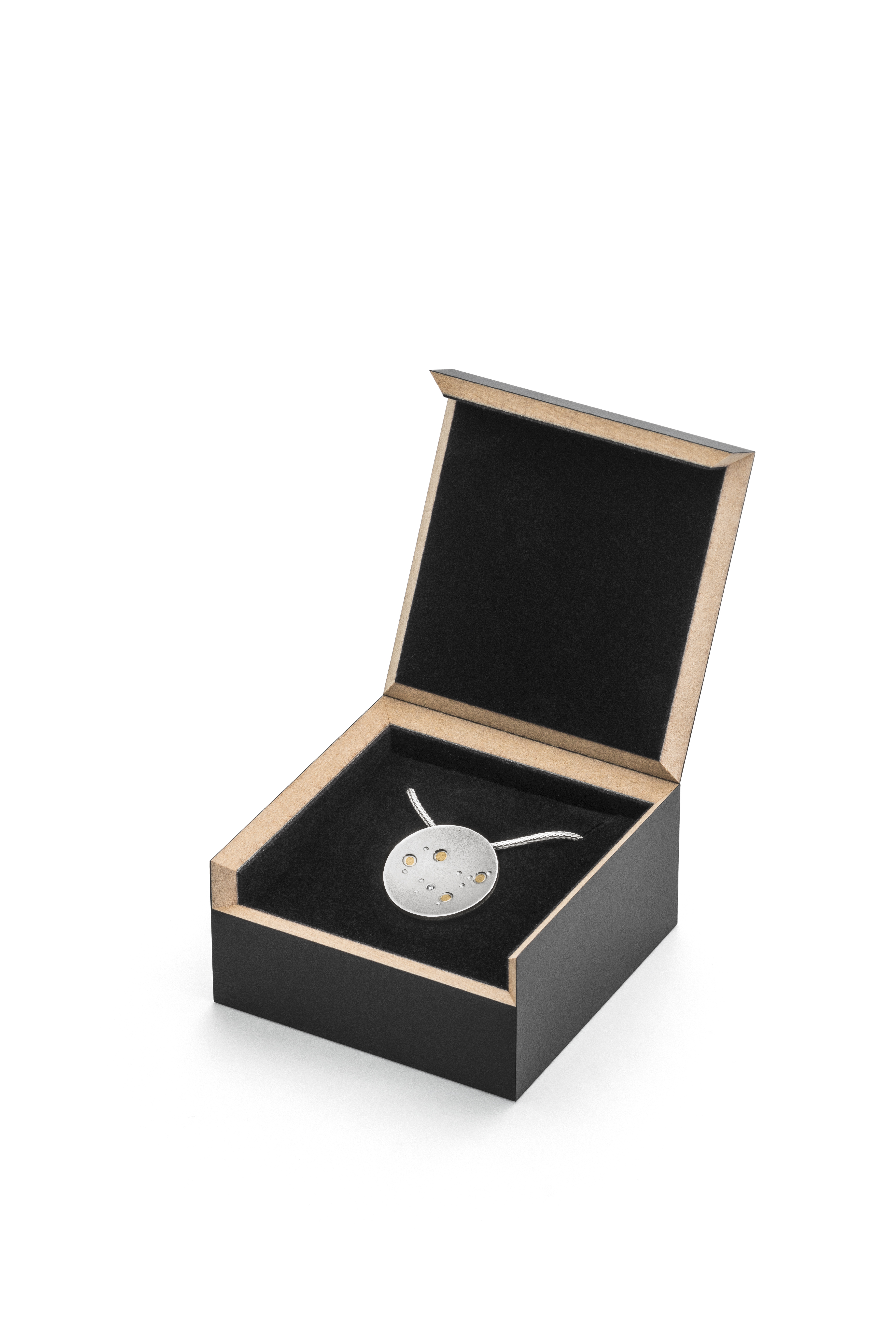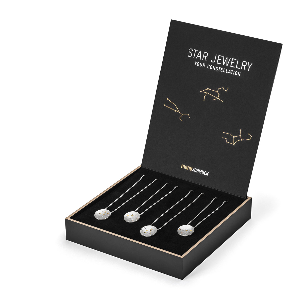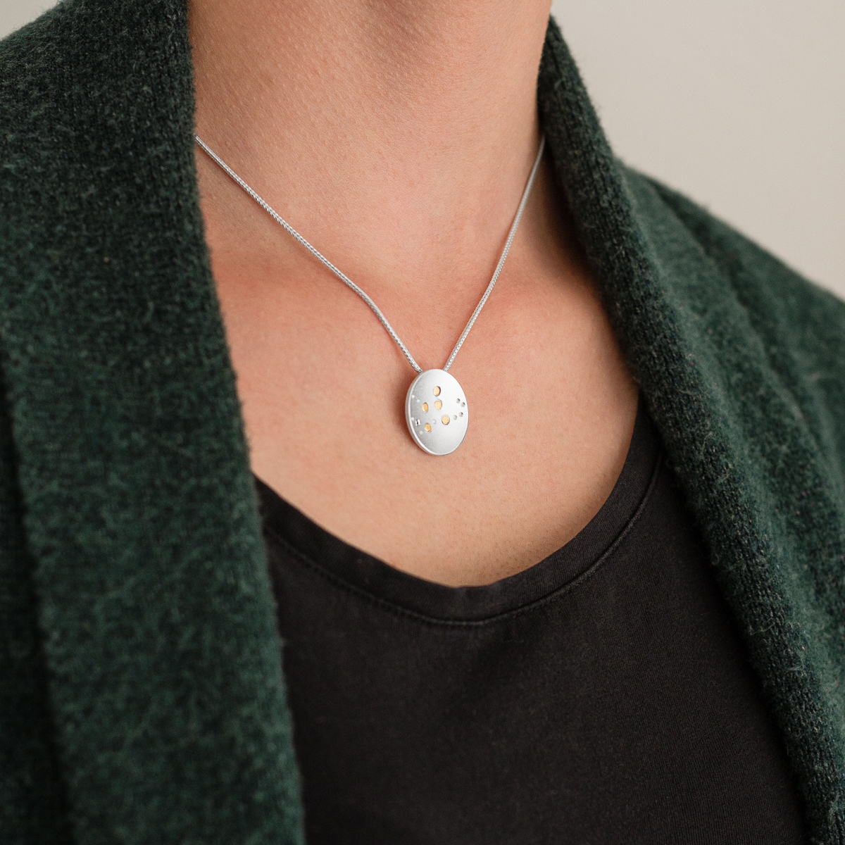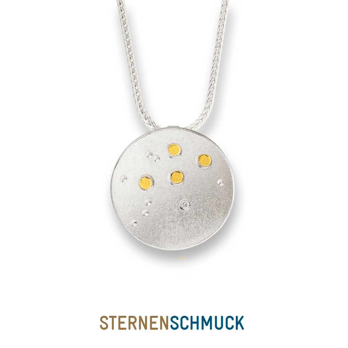 Die Sternenkonstellation des jeweiligen Sternzeichens ist auf einer aufgetieften Scheibe aus Sterlingsilber mit Punkten aus 900/- Gelbgold, einem Brillant und feinen Punzierungen dargestellt.